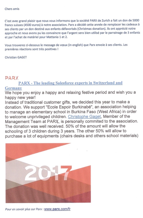 Noël 2016, un don important et original de la société Suisse PARX dans la corbeille de l'Association E.E.B.